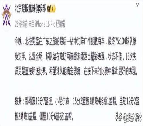 賽后,北控官方社媒發文: