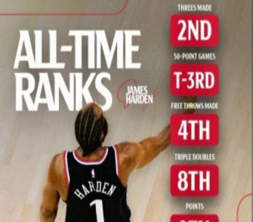 哈登多項數據歷史前25:三分命中數第二罰球命中第四總得分第九