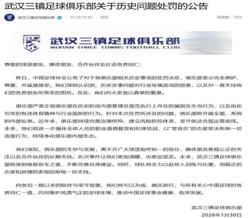 今天下午,武漢三鎮在俱樂部官方社交賬號上發布公告,稱完全擁護、尊重并誠懇接受中國足協的處罰決定,深刻認識到歷史涉事問題對行業環境造成的損害,并致以真摯的歉意。